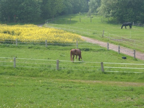 Direkt am Waldesrand liegen unsere Weiden. Auf den pferdegerecht eingezäunten Koppeln genießen unsere Pferde den großzügigen Auslauf.